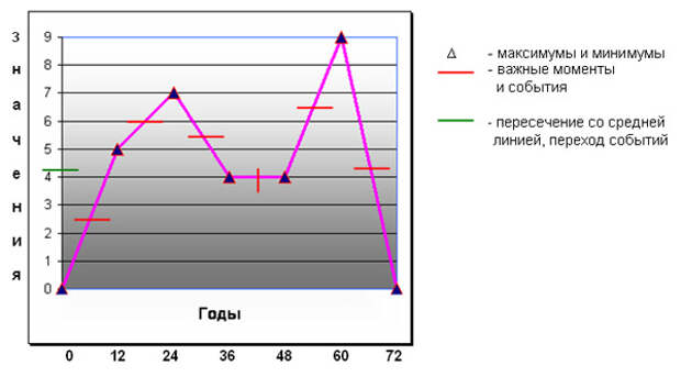 Нижная половина графика (от 0 дот 4,5) связана с накоплением, отдачей долгов, заболеваниями, лечениями, препятствиями и испытаниями,