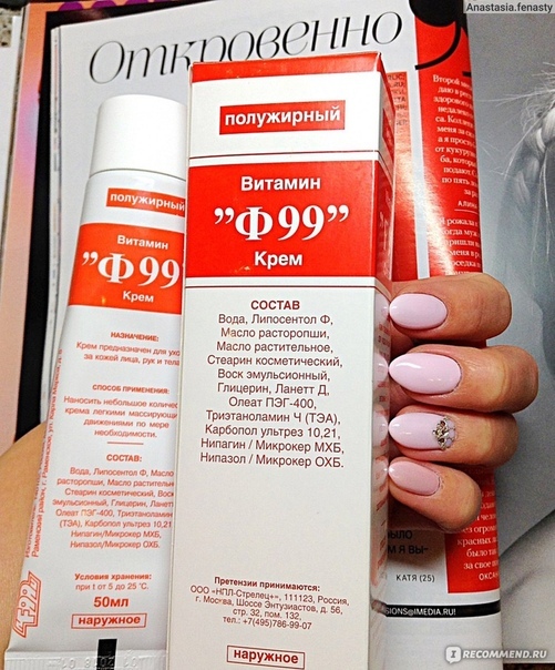 Дерматологи назначают крем «Ф-99» людям, которые страдают экземой. Но это средство нашло применение еще и в косметологии, в первую очередь из-за высокого содержания витамина F и полиненасыщенных жирных кислот. Крем угнетает воспалительные процессы, стимулирует выработку коллагена и сохраняет каркас кожи. К тому же витамин F удерживает влагу в эпидермисе и препятствует появлению морщин.