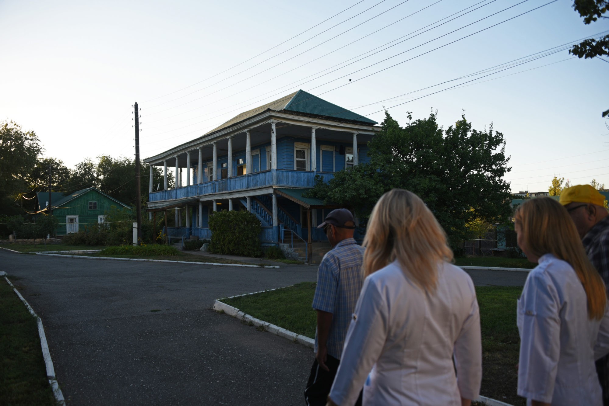 Иногда кажется, что время здесь вообще остановилось. Вокруг — почти центр Астрахани. Со всех сторон выросли многоэтажки. А тут по-прежнему крохотные почти деревенские домики: лаборатории, хозяйственные постройки, гостиница для аспирантов и ординаторов. Один корпус, синий с белыми колоннами, сохранился еще со времен сада «Богемия». Когда-то на первом этаже было казино. А теперь тут живут незаразные больные.