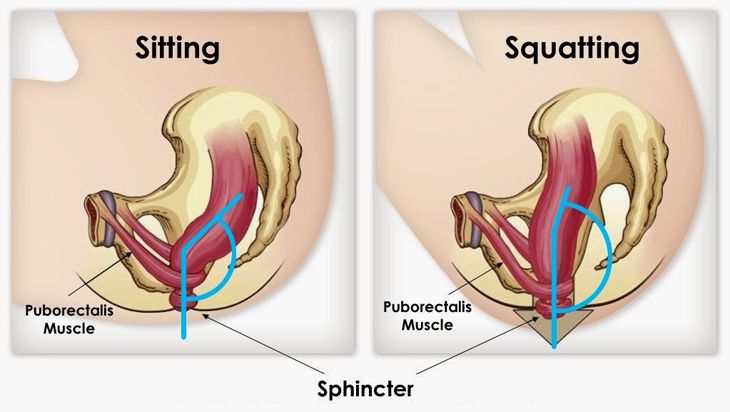 Современный унитаз является крайне неестественным для дефекации. Сидя на унитазе (на рисунках обозначено sitting, а сидение на корточках - squatting), вы располагаете кишечник под сложным углом, но и обездвиживаете кое-какие мышцы малого таза (пуборектальные), которые нужны для участия в процессе. Такой аноректальный угол повышает давление в кишечнике и внутрибрюшное давление (риск грыж!), что является фактором риска развития многих болезней. Повышенное давление может способствовать нарушению работы илеоцекальной заслонки и забросу содержимого толстого кишечника в тонкий.